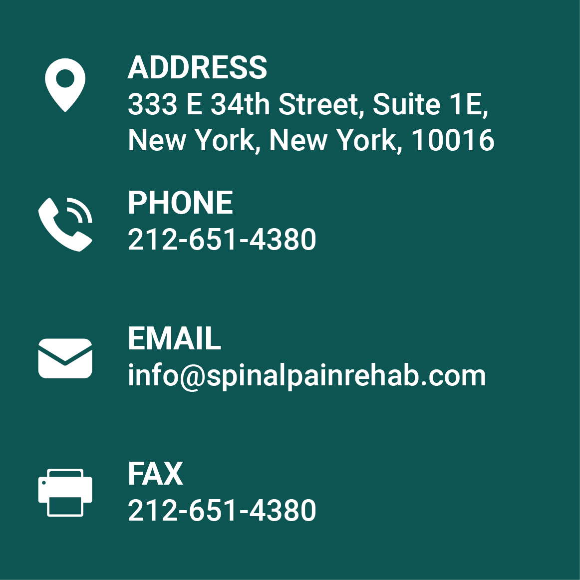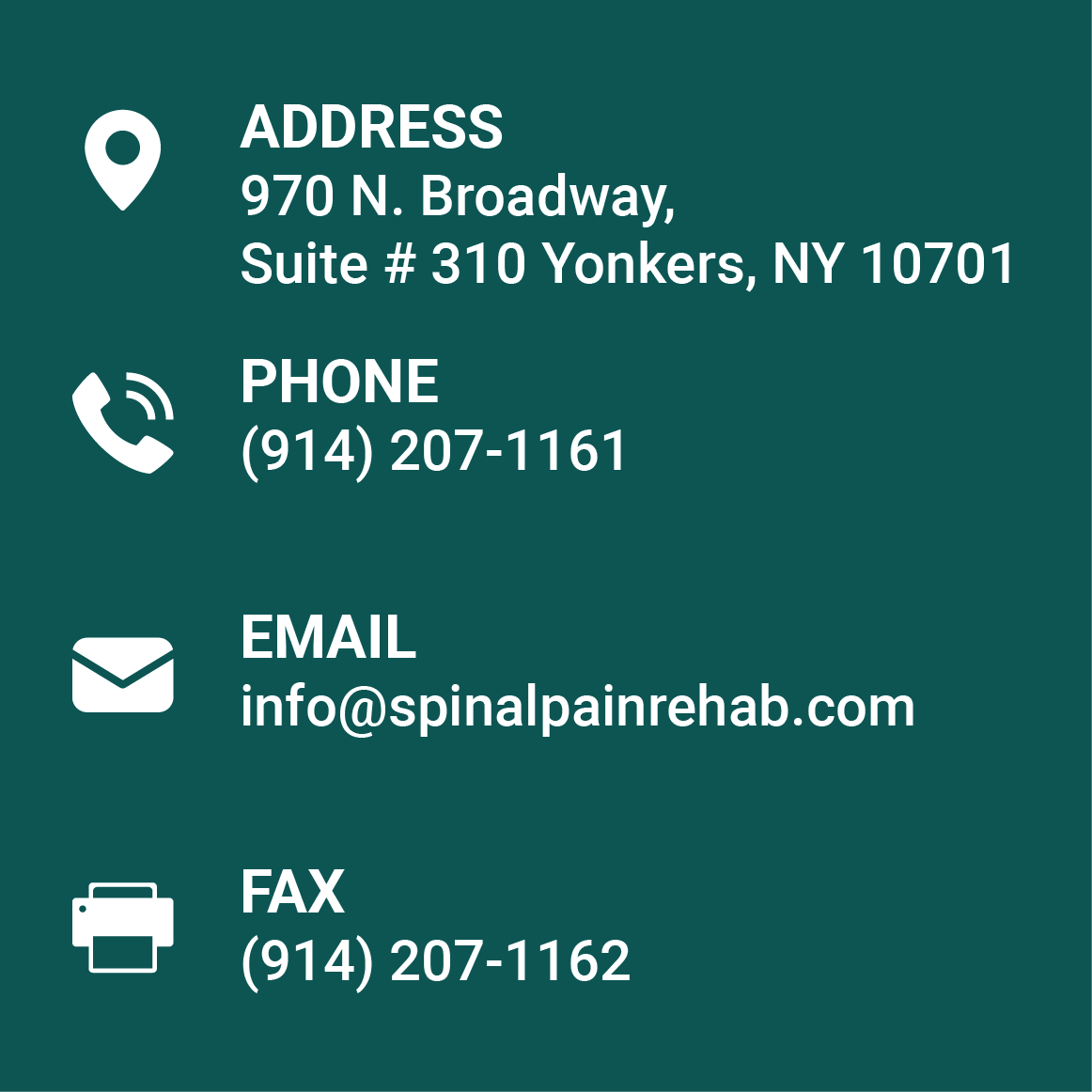 Spinal pain & Rehab Medical yonkers:- 970 N.Broadway,Suite # 310 Yonkers,NY 10701 | Phone :- (914)207-1161 | Email :- info@spinalpainrehab.com | Fax :- (914)207-1162 Spinal pain & Rehab Medical Manhattan-Murray Hill:- Spinal Pain and Rehab Medical 333 E 34th Street Suite 1E New York, New York, 10016| Phone :- 212-651-4380 | Email :- info@spinalpainrehab.com | Fax :- 212-651-4380